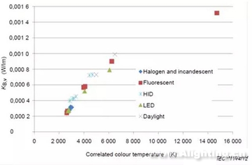 通过研究一系列不同光源的光谱,能观察发现:KB,V值与所有白光光源色温CCT有强烈的线性相关性,如白炽灯、气体放电灯、荧光灯、LED灯等,如图1所示。
