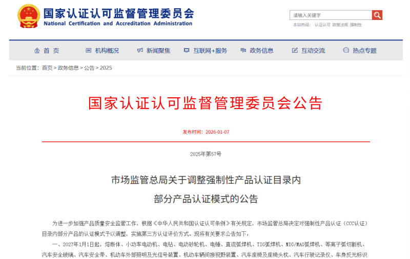 2025年12月28日,国家市场监管总局发布2025年第57号《关于调整强制性产品认证目录内部分产品认证模式的公告》。